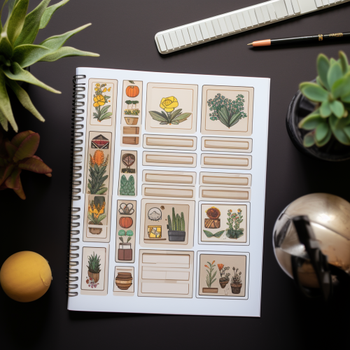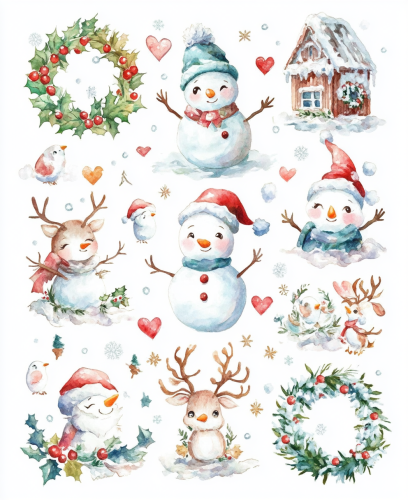 Watercolor Christmas sticker sheet of cute snowman, reindeer, and elves. The stickers have various expressions such as smiling or sitting on the roof. It includes decorative elements like wreaths, flowers, hearts, and garlands --ar 83:101 --v 6.1