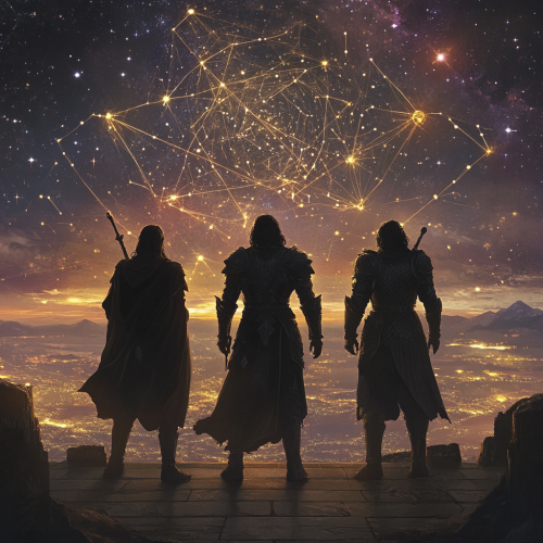 three men in plate armor stand small, silhouetted against a world and skyline that is filled with symbols of constellations, astrology, and celestial mechanics. It's gorgeous and highly detailed. Dynamic lighting, cinematic quality. Surrounding the three silhouettes are magical portals that lead to different worlds.