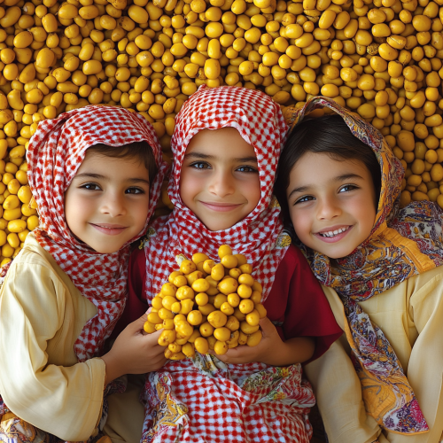 realistic image of three Omani children wearing traditional Omani clothing, lying on clusters of yellow dates in the ‘busr’ stage (when dates are unripe and yellow). The children are smiling brightly and looking joyful, surrounded by a background fully covered with tightly packed date clusters. The child in the center is wearing a red and white checkered headscarf and holding a bunch of yellow dates, while the other two children wear simple, traditional headscarves in neutral colors. The lighting is soft and warm, highlighting the vibrant yellow of the dates and the light color of the children’s clothing 3:2