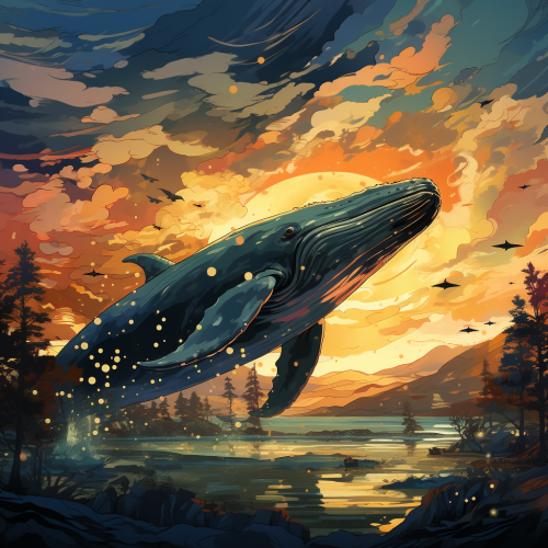 in colored manga, 3 humpback whales flying in sky, stars and planets filled sky, golden sunset, digital art behance, flat abstract colors in yellow and pink shades, line art with bold outline, use only 3 strong colors, beautiful morning lights, masterpiece, 4k, mystical setting --s 750