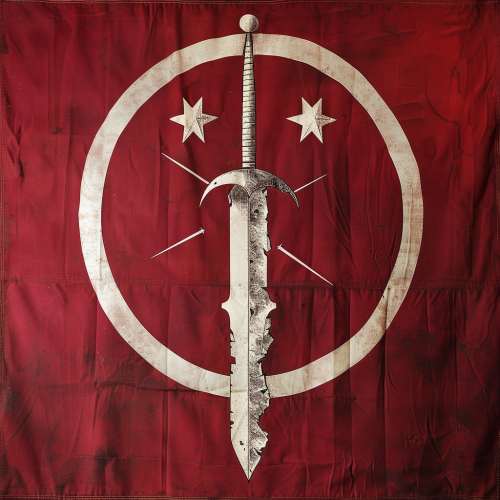 emblem on the crimson flag showing a white round circle on top, on the left side of the circle three stars are arranged in a gentle arc and on the right side the same, under the white circle is arranged blade down a simple medieval sword