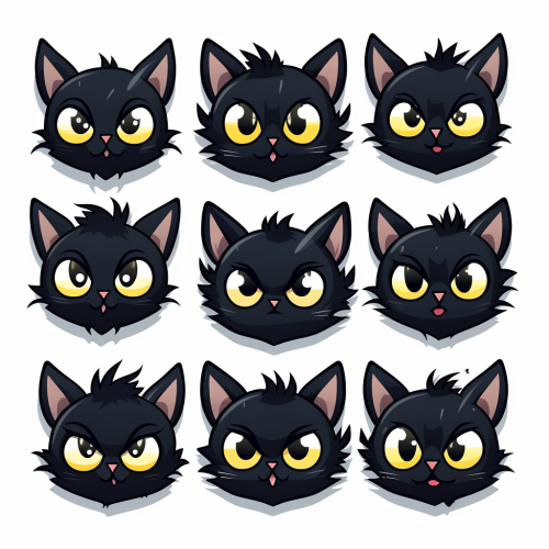 cartoon black evil cat head, cute, vector set, sticker sheet, white background