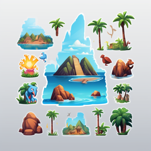 island, icon, Sticker sheet, minimalist, Pixar style, cartoon animation--ar 2:3