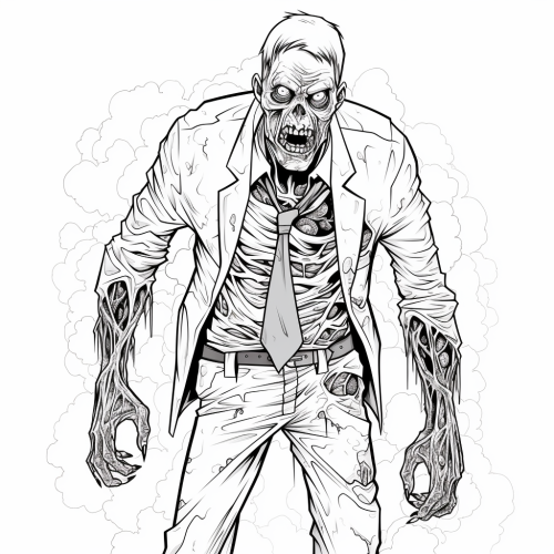 adult coloring book, line art, white background, black, thick outline, zombie, full body zombie,