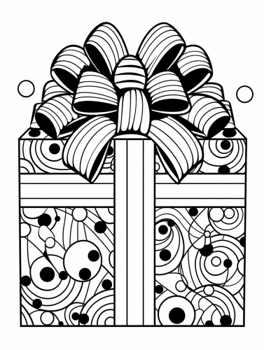 coloring book page, a white background geometric shaped box covered with black OUTLINE circles, a black ribbon on top, --ar 9:12 --c 5