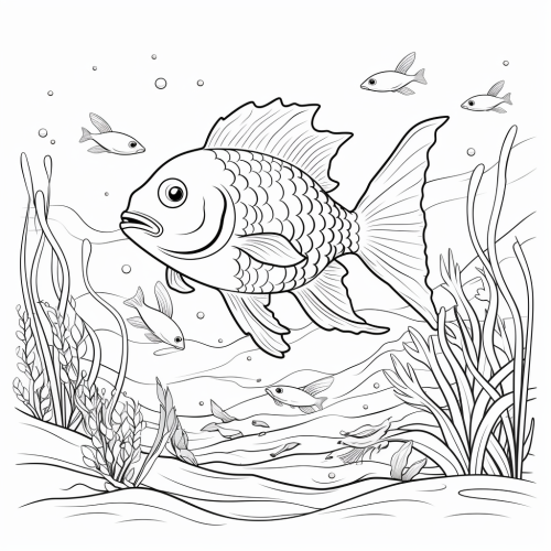 fishtales under the sea scene, simple cartoon childens coloring book illustration, dark outline, black and white