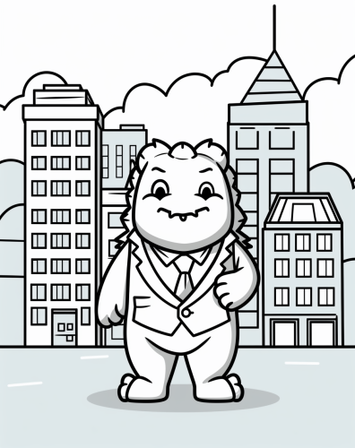 Coloring page for kids, style of coloring book, a picture depicting Godzilla in the city, white background, vector illustration by flaticon and dribble, behance hd, made in figma, adobe xd, sketch, ux, ui, ux/ ui, crisp and pixel - perfect design, black and white, minimalism, flat colored outline icon style, simplistic design, no black fill, cartoon style, --ar 15:19