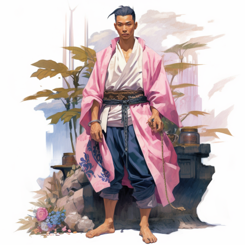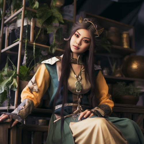 A asian elf in a set of plant based clothes that have an amalgamated style of Traditional Tibetan robes and Tolkien Elvish set in a similar style to 'One Piece' by Japanese mangaka Eiichiro Oda
