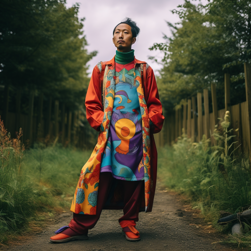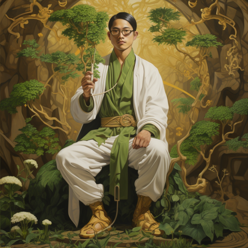 A asian man in a set of plant based, green and gold and white clothes that have an amalgamated style of Traditional Tibetan robes and Tolkien Elvish set in a similar style to 'One Piece' by Japanese mangaka Eiichiro Oda
