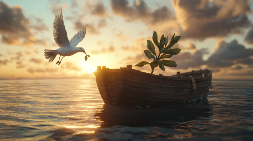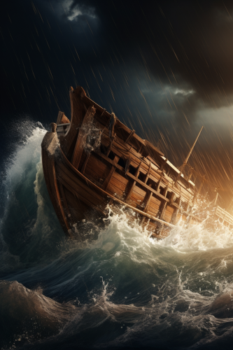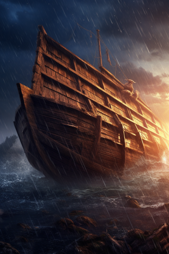 The ancient biblical wooden ark of Noah inside a heavy storm. Dramatic light, apocalyptic scenery, Geographic Photo, insanely realistic and detailed, hyper realistic, ultra realistic photo scenery --no people --ar 2:3