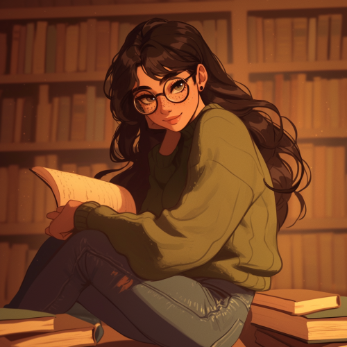 a beautiful woman, 2000s nerdy aesthetic, pale skin, dark hair, dark eyes, wearing glasses, freckles, wearing a cute ugly sweater and jeans, is studying in a 2000s high school library background, 2000s high school theme, 2000s high school setting --niji 6