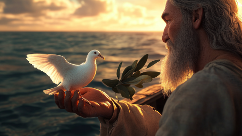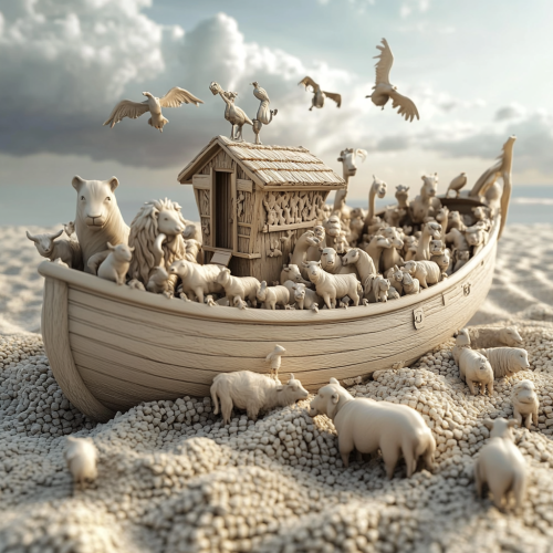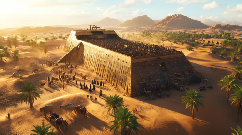 drone shot of the prophe Noah and his family, and the animal entering the Ark, the ark is enormous set in the desert of the mid east, there are palm trees and sand hills in the back ground, realistic, 4k, --ar 16:9