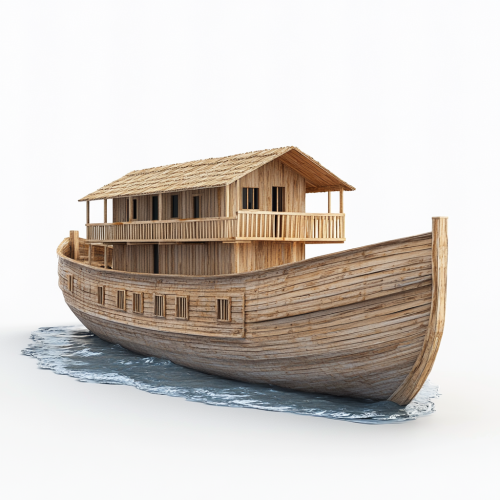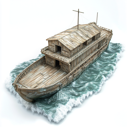 wide angle view of Noah's ark. It is rectangular with no pointed bow. There is a raised cabin in the middle of the ark's upper deck. It is in turbulent waters. isolated on white backfround, photorealistic