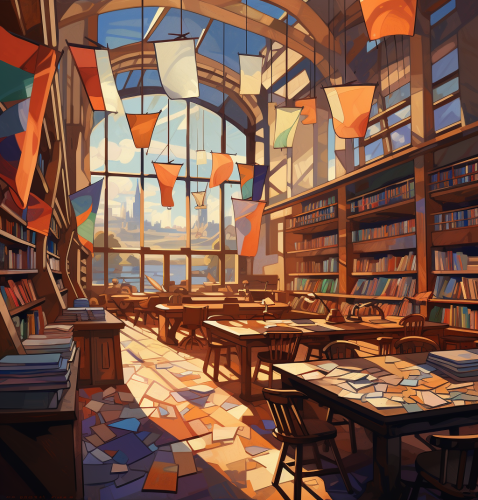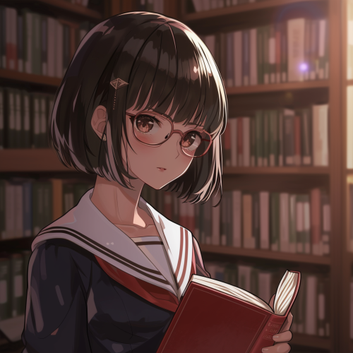 Girl with short bob hair, brunette, brown eyes, glasses, high school uniform, doing library duty, nerd, anime art style --v 6.0 --s 50