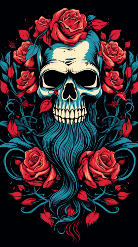 2d flat ilustration of bearded mad skull, biker, red roses, thorns, dia de los muertos, tim burton style, --ar 9:16