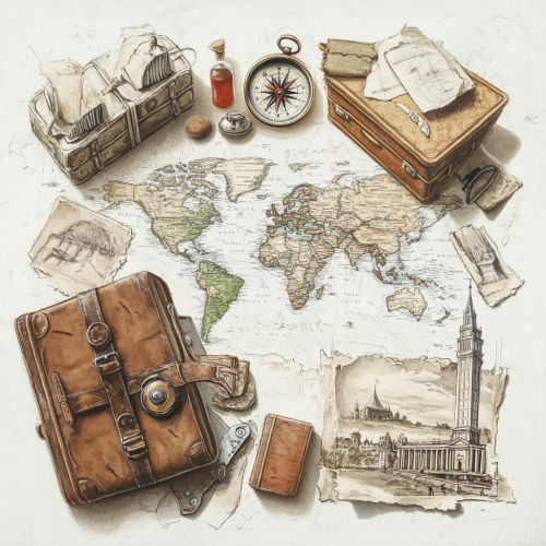 Drawing of Miniature maps, monuments, compass and suitcases scattered around center of the White background. Everything in retro style or in shades of brown and beige.