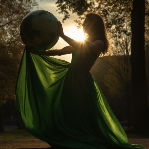 woman with backlit, late evening sun, wearing a long flowy green dress, lifting a large globe