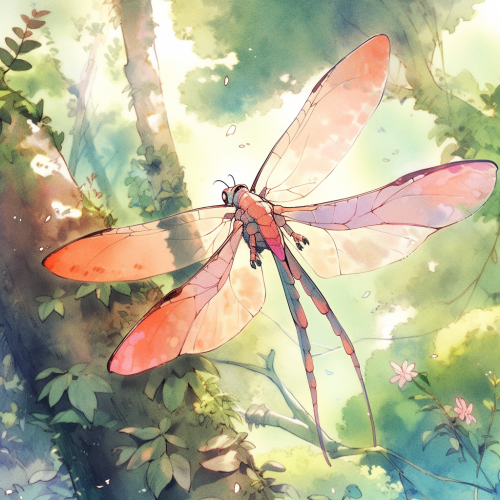 Giant dragonfly, flying on tree tops, ghibli style, watercolour --niji 5