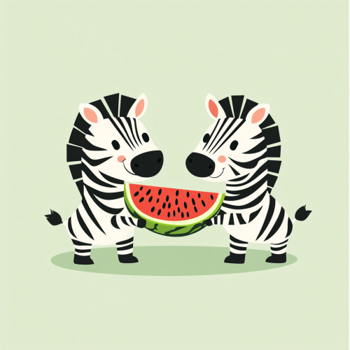 Vector illustration of two zebras. One zebra is looking at a watermelon in his hand and is very happy in the center on a light green background. The style is simple and minimalist, and the cartoon design is cute.