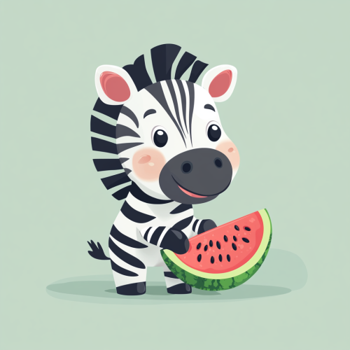 Vector illustration of a zebra. A zebra is looking at a watermelon in his hand and is very happy in the center on a light green background. The style is simple and minimalist, and the cartoon design is cute.