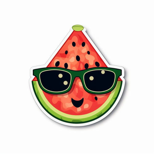 Die-cut sticker, Generate a kawaii sticker of a cheerful watermelon slice with a happy face, wearing sunglasses. The watermelon should have rosy cheeks and be surrounded by tiny bees and flowers. Vector, illustration, white background. --v 5.1 --s 750