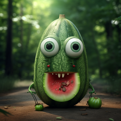 a funny watermelon with one big eye, one small eye. A long tongue and one big ear, one small ear, and a human nose