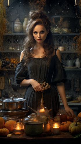 in an abandoned ball room, there is a long clothesline stretching across. a witch is casting a spell making the clothes drying on the clothesline come alive --ar 3:4 --p wp561mn --v 6.0