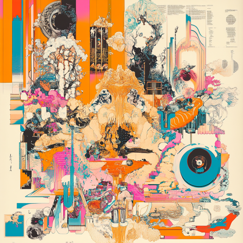 Creative analyses of modern art. The page is filled with one main object and around it there are multiple panels that showcase detailed line work of different artists and cultures, scales, and other intricate details. Aesthetic combines classical serenity with dynamic data chaos, illustrating tradition meeting innovation. Contrast, richness in detail. Color palette pink, orange, blue --v 6.1 --style raw