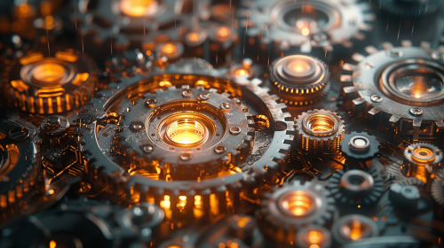 Generate a high-resolution image of intricate gears and cogs machinery, arranged in a visually cohesive layout. The image should feature various interlocking components with fine details, but with a slightly washed-out effect to serve as a subtle, non-distracting website background. Use soft lighting to gently highlight the metallic textures while keeping the color palette muted and the contrast low. This will create a sleek, industrial aesthetic that complements text and graphics overlaying it. --ar 16:9 --v 6.0 --s 1000
