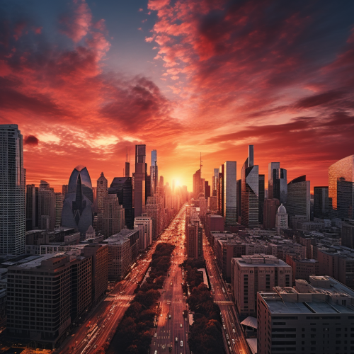 Take a panoramic shot of a city skyline at sunset, highlighting the city’s architecture.