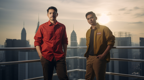 two young indonesian businessman wearing red shirt is posing on a rooftop, skyline view, skyscrapers, sunset, fullbody, taken with Canon EOS 5D Mark IV DSLR camera, using an EF 50mm f/ 1. 8 STM lens. The resolution should be 30. 4 megapixels, with an ISO sensitivity of 32, 000, and a shutter speed of 1/ 125 second. Photorealistic and ultra detailed. The lighting should be warm and bright, bright light, The colors should be vibrant and rich --v 5.2 --ar 16:9