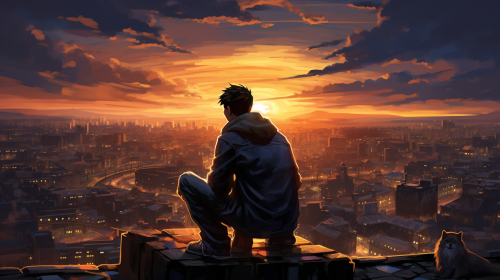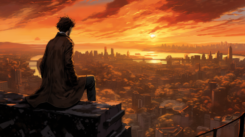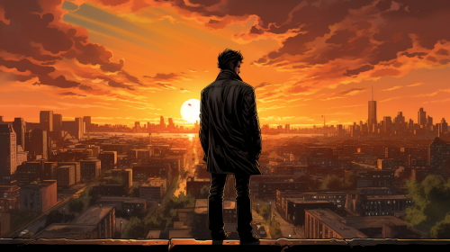 A businesswoman in a medium shot, standing at the top of a skyscraper rooftop, gazing out over a busy city at sunset. The warm orange glow of the setting sun casts a golden hue on her, with the towering buildings below representing her success. Photorealistic detail, hd quality, dynamic lighting --ar 16:9 --v 6.0