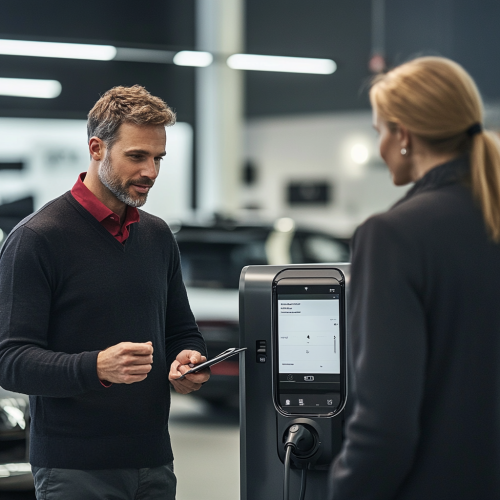 EV car being charged inside of the garage of a house, charging station on a wall of a garage, battery system, result photo from the side --v 5.2 --style raw --ar 3:2