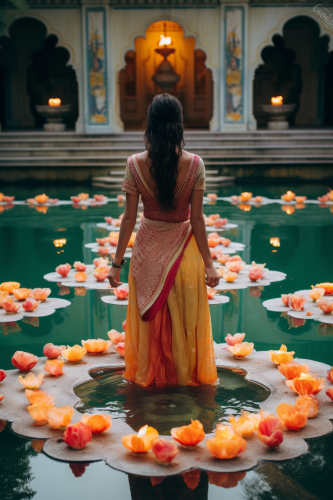 long shot photo of an eccentric traditional indian lady wearing saree saint with saffron saree, placing a lotus shaped bowl of fire in water, haute couture, symmetry, colorful palace gardens, river with bowls of fire, summer, pastel colors --ar 2:3 --v 5.2