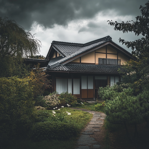 modest architectural photorealistic image of a traditional japanese Minka, autumn day in japan, Sony Alpha 7R V, 35mm lens, f/16, soft natural light on a cool japanese day, deep depth of field, subdued colors, ISO 250, 1/60 sec --style raw --stylize 30 --v 6.1