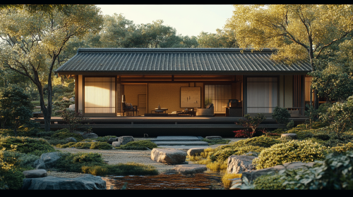 architectural photorealistic exterior of a traditional japanese house with an exterior engawa, cool natural scene, Sony Alpha 7R V, 35mm lens, f/2.6, sof natural light on a cloudy day, shallow depth of field, subdued colors, ISO 250, 1/60 sec --style raw --stylize 20 --v 6.1
