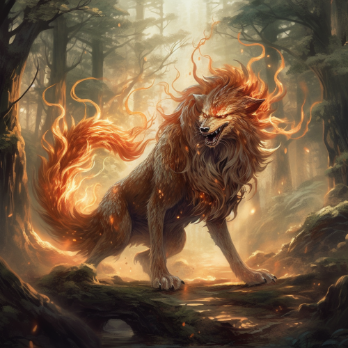 An enormous, mythical nine-tailed fox from ancient Japanese folklore, depicted as a giant, dragon-like creature. The fox has a fearsome and majestic presence, with sharp, glowing eyes, and its fur flowing like flames. Its nine tails are massive and swirling, each tipped with ethereal fire. The background is a dark, misty forest with a mysterious atmosphere, emphasizing the creature's powerful and terrifying aura. The scene should evoke a sense of ancient legend and supernatural power, with intricate details on the fox's fur and scales, resembling a dragon's texture --v 5.0