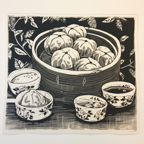 Japanese block print style, traditional woodblock printing with visible texture from carved wood grain, simple black and faded red inks, nighttime scene in a Japanese village with wooden houses, paper lanterns softly glowing in faded red, dark sky with a subtle moon casting gentle light, people in kimonos walking along narrow streets, cherry blossom trees with delicate petals in black ink, reflections in a nearby river or pond, mist and shadows creating depth, Ukiyo-e influence with intricate line work, rough and natural textures from woodblock technique, minimalist color palette evoking a serene, tranquil night atmosphere. --v 6.1 --s 50 --ar 16:9