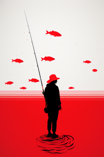 poster image representing fishing,the art of fishing and fishmongers,modern design,minimalist,masterpiece,black white and red,detailed --ar 2:3 --s 250