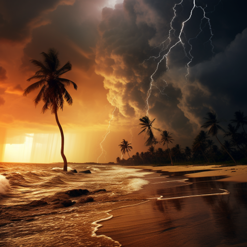 postcard photo of beautiful sandy beach with palm trees, calm sunny sky in east and strong, dark storm with lightning coming in from distance the west