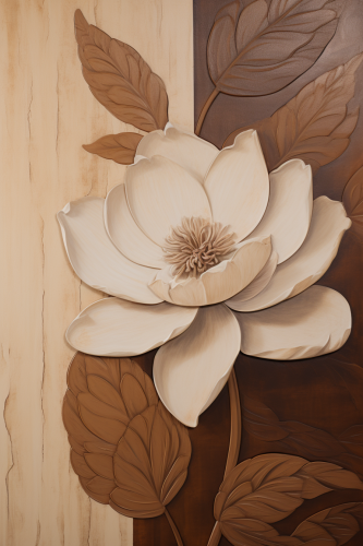 a brown flower on a brown background, in the style of contemporary tapestries, neutral color palettes, naturecore, ivory, layered veneer panels, reverent and tranquil, serene harmony --ar 2:3