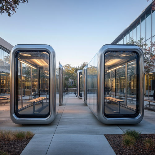 Inside a sleek, transparent reading capsules in a university library outdoor, looking out through clear walls at a minimalistic, modern area. The outside area is structured with smooth concrete pathways and minimal greenery, surrounded by stark, white and glass buildings with clean lines and large, uninterrupted glass facades. Outside, there are metal benches and straight-edged seating areas for group study, arranged symmetrically along the area. The open space feels cool and orderly, with sparse, steel lighting fixtures casting an even, bright illumination. The environment feels structured and controlled, with a polished, contemporary aesthetic that emphasizes simplicity and form