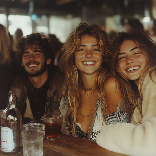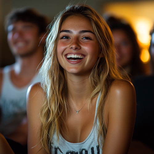 Group of young university students playing truth or dare. They are on the house party and they are sitting on the couch, one of the students is calling someone and everyone laughs --style raw --s 750