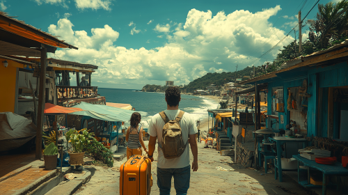 Setting: Arrival in San Juan del Sur. Personajes que intervienen: The protagonist and Leonel. Character Description: Protagonist: A curious and thoughtful young man, eager to explore his new environment. He carries a small suitcase and appears slightly weary from travel, but his face shows excitement. Leonel: A calm and composed man in his 40s, playing with his young daughter. He has an air of wisdom, dressed simply in work clothes, with a welcoming smile as he greets the protagonist. Cinematic Shot: A wide shot of the protagonist approaching Leonel’s house, transitioning to a medium close-up as they introduce themselves. The camera follows the protagonist from behind as he walks into the house, capturing the quaint street leading to the beach in the background. Location: Leonel’s house, on the main street leading to the beach in San Juan del Sur. Era: 1998. ultra realistic photography 64K resolution,extreme high detail. --style raw --s 750 --ar 16:9 --v 6.1