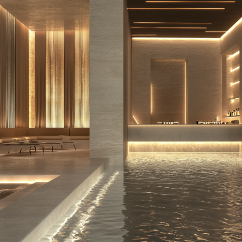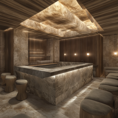Design a transformative spa bar within a 9x12 meter space, featuring a rectangular configuration with a central bartender area. Surround the bar with sleek bar stools and private, plush seating zones. Employ natural materials such as wooden veneer and granite countertops, and include striking, volumetric ceiling elements. The design should redefine conventional bar aesthetics with a sophisticated, modern approach that seamlessly integrates elegance and functionality