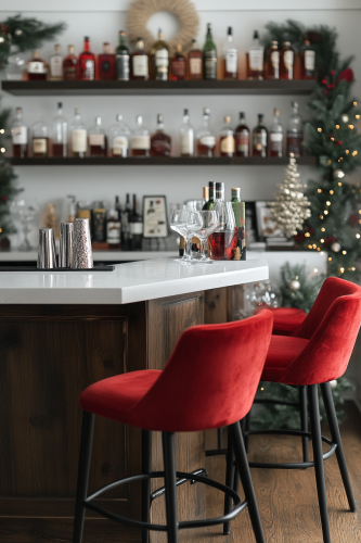 Show a bar area styled with a sleek modern Christmas aesthetic, featuring clean lines, minimalist decorations, and a monochrome color scheme with pops of red or gold. The bar should be equipped with modern glassware, a stylish arrangement of bottles, and subtle holiday accents like small wreaths or geometric ornaments. Capture the entire bar in a way that emphasizes its contemporary design and festive touches. This stylish and organized image should attract viewers interested in modern Christmas ideas. Camera: DSLR - Canon EOS 5D Mark IV. Lens: Canon EF 24-70mm f/2.8L II USM. Composition: Wide shot, room-centered, horizontal orientation, balance between furniture and space. Film: Digital, high resolution, color profile sRGB. Camera settings: ISO 400, f/2.8, 1/60 sec. --ar 2:3 --v 6.1 --s 250
