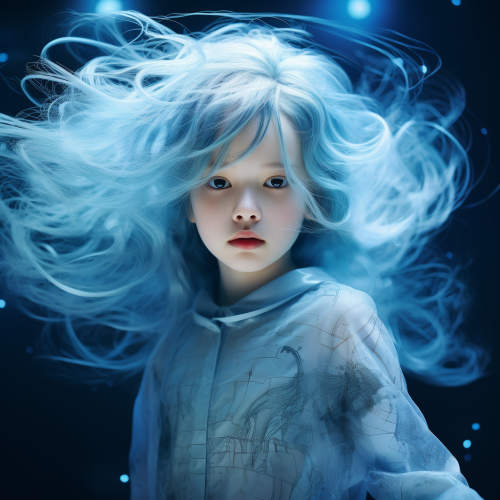 14 years old girl in full length, translucent, artificial intelligence, blue hair, wind streams around