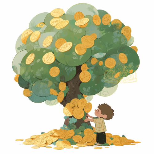 A little boy stands under a large gree tree filled with gold coins, picking the coins. Miyazaki Hayao style .cute design. creative, fun,sweet colour.white background --niji 5 --s 250 --style expressive