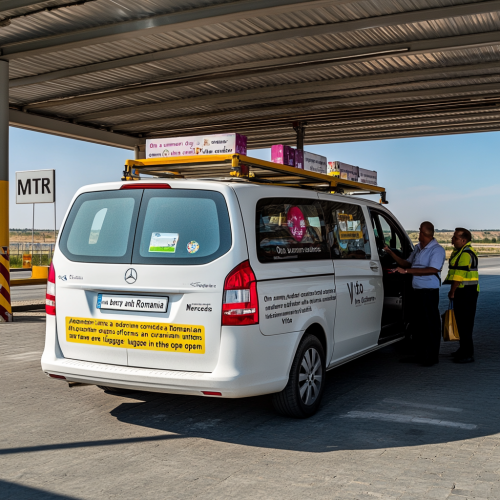 on a sunny summer day in the territory of the customs control of Ukraine and Romania, where the border guards dressed in the uniform of the border guard of Ukraine and the customs officer check the luggage carried by a modern white Mercedes Vito car standing under the roof at the checkpoint with an open trunk and suitcases and passengers inside the car are visible who are sitting on the seats A vivid travel scene showing a modern car on a scenic journey from Ukraine to Bulgaria to the sea The image shows the car driving through the picturesque landscapes of Romania and Bulgaria, near the sea with an emphasis on dynamic road signs for shopping vignettes and toll roads. Add a border checkpoint with a MOT sign, and badges or decals representing your green card and life insurance. Add visuals like maps, hotel reservations, and travel essentials to emphasize adventure and preparation. Use bright, eye-catching colors and detailed imagery to convey a safe and enjoyable journey.Depth of field, Tilt blur, Shutter speed 1/1000, F/22, White balance, 32k, Super resolution, Pro Photo RGB, Backlight, Backlight, happy Lighting, Incandescent, Soft Lighting, Surround, Conte Jour, Global Illumination, Global Screen Space Illumination, Scattering, Shadows, Rough, Flicker, Backlight Reflection, Screen Space Reflection, Diffraction Estimation, Chromatic Aberration, GB Bias, Scan Lines, Ambient Occlusion, A RTX, SSAO, OpenGL Shaders, Post Processing, Post Production, Cell Shading, Tone Mapping, CGI, VFX, SFX, Insanely Detailed and Complex, Hypermaximalist, Elegant, Dynamic Pose, Photography , volumetric, ultra-detailed, complex details, super-detailed, environment --ar 1:1