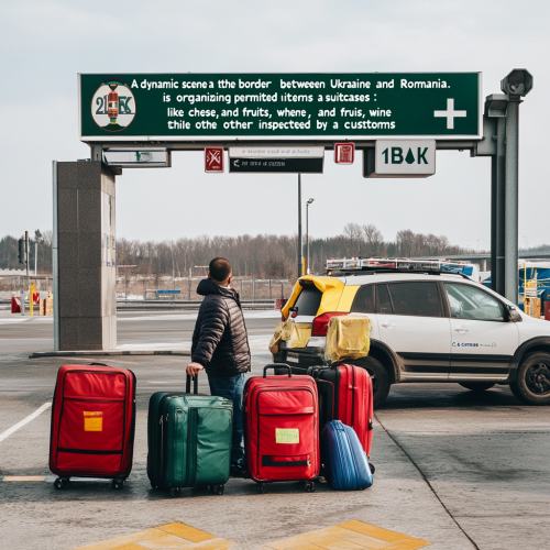 "A dynamic scene at a border crossing between Ukraine and Romania. In the foreground, a traveler is organizing their luggage in two suitcases: one showing permitted items such as wine, cheese, and fruits, and the other being checked by a customs officer with prohibited items like rare animal products and counterfeit goods clearly marked with red ‘X’ symbols. The traveler is holding travel documents, smiling, as the officer approves their allowed items with a green checkmark. In the background, a sleek transfer vehicle is parked with its trunk open, packed with neatly arranged, compliant luggage. The vehicle is parked next to a large border sign showing the flags of both Ukraine and Romania. Mountains and a clear blue sky give the sense of a scenic, comfortable journey. Above, icons of an airplane and bus signal different modes of travel, and small, playful arrows highlight the correct and incorrect baggage choices." A vivid travel scene showing a modern car on a scenic journey from Ukraine to Bulgaria to the sea The image shows the car driving through the picturesque landscapes of Romania and Bulgaria, near the sea with an emphasis on dynamic road signs for shopping vignettes and toll roads. Add a border checkpoint with a MOT sign, and badges or decals representing your green card and life insurance. Add visuals like maps, hotel reservations, and travel essentials to emphasize adventure and preparation. Use bright, eye-catching colors and detailed imagery to convey a safe and enjoyable journey.Depth of field, Tilt blur, Shutter speed 1/1000, F/22, White balance, 32k, Super resolution, Pro Photo RGB, Backlight, Backlight, happy Lighting, Incandescent, Soft Lighting, Surround, Conte Jour, Global Illumination, Global Screen Space Illumination, Scattering, Shadows, [...]